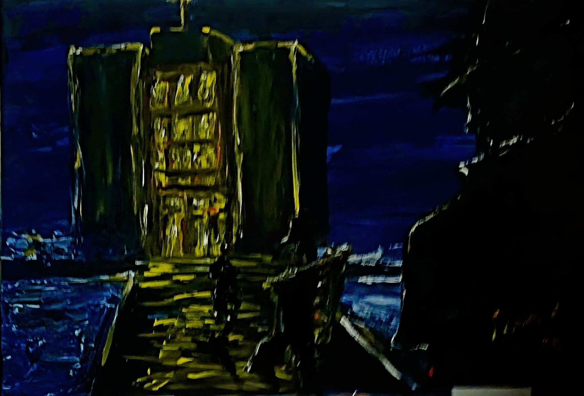 Zlatni prozori crkve sjaje kao zvijezda koja ih je okupila. U ovoj hladnoj, plavoj noći, jedina stvarna toplina nastaje u prostoru između ove tri figure – u trenutku kada onaj koji ima (mi) prepozna onoga koji treba (prosjak), i zajedno krenu prema Onome koji je sve (Bog)."
