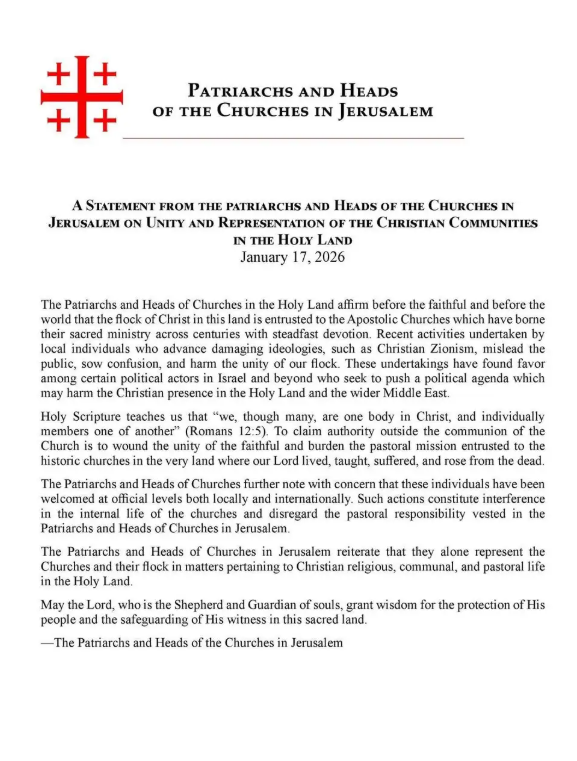 Službeno priopćenje kršćanskih crkava u Svetoj zemlji o trenutnim problemima s kojima su suočeni, te netrepeljivostima prema kršćanima u toj zemlji objavili su patrijarsi i poglavari crkava 17. siječnja 2026. godine. Njihovo priopćenje u potpunosti prenosimo prevedeno na hrvatski jezik: