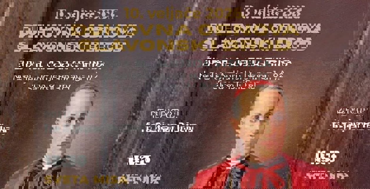 Duhovna obnova u Slavonskom Brodu koju predvodi fra Stjepan Brčina, održat će se u Župi bl. Alojzija Stepinca, 10. veljače 2026. godine. Započet će svetom misom u 18:30, a nakon toga slijede klanjanje i slavljenje.