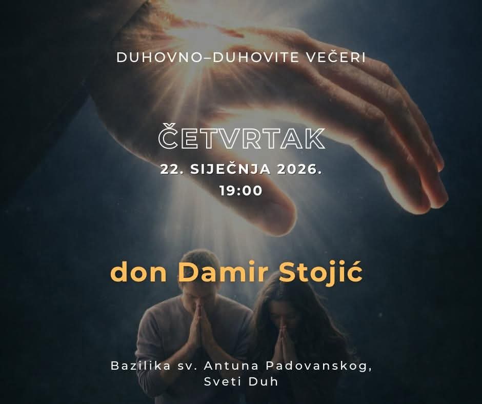 Fra Stjepan Brčina na svom Facebook profilu objavio je poziv na " Duhovno - duhovite večeri" u baziliku sv. Antuna Padovanskog na Svetom Duhu, u četvrtak 22. siječnja 2026. godine u 19 h.