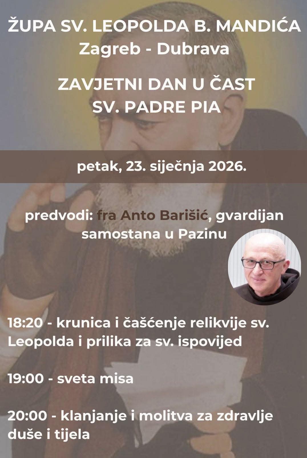 Župa sv. Leopolda Bogdana Mandića Zagreb - Dubrava poziva sve župljane i vjernike na zavjetni dan sv. Padre Pija u petak 23. siječnja.