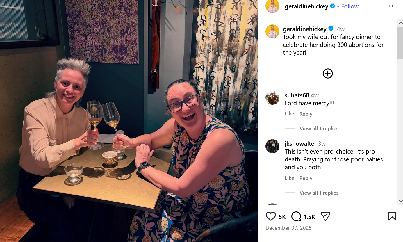 Australska komičarka Geraldine Hickey preko društvenih mreža pohvalila se da je izvela svoju partnericu, Catherine Bateman na večeru kako bi proslavile smrt 300 beba koje je usmrtila Catherine radeći u klinice za abortuse u 2025. godini.